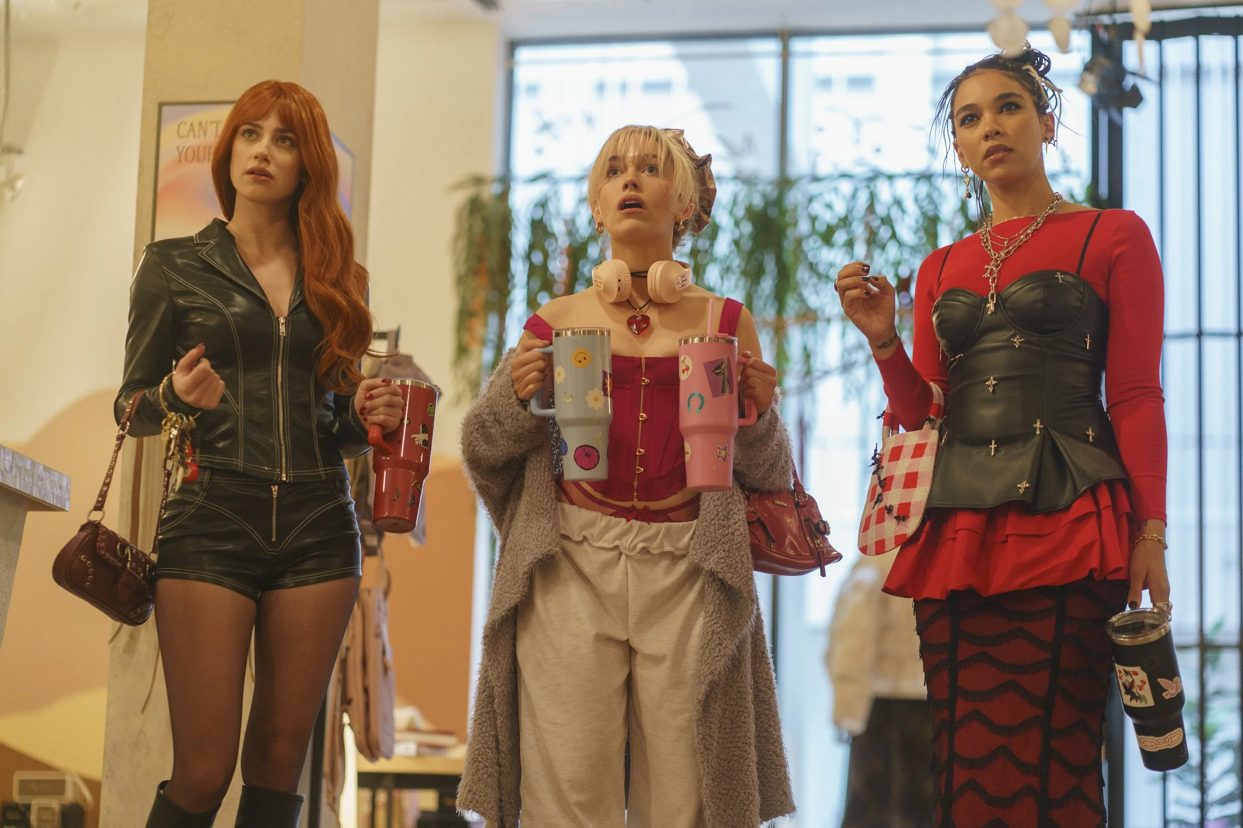 A giallo-infused brew of Mean Girls-level comedy and unruly gore out of a depraved slasher, Forbidden Fruits is a stylish satire of performative sisterhood anchored by four flawless, fabulously dressed leads. The first three of which we meet as they strut through Dallas’ Highland Place Mall (filmed, in fact, at the same location as Mean Girls), learning through faceless whispers that the fashionable Free Eden employees (a thinly-veiled spin on Free People) are “mall royalty” who don’t even have to pay for lunch at the food court. Calling themselves “fruits” and changing their names to Apple (Lili Reinhart), Cherry (Victoria Pedretti), and Fig (Alexandra Shipp), the women run an after-hours witchy cult in their retail store—and the unseen commentators also don’t neglect to mention that the cult’s leader, Apple, is a “bitch”.