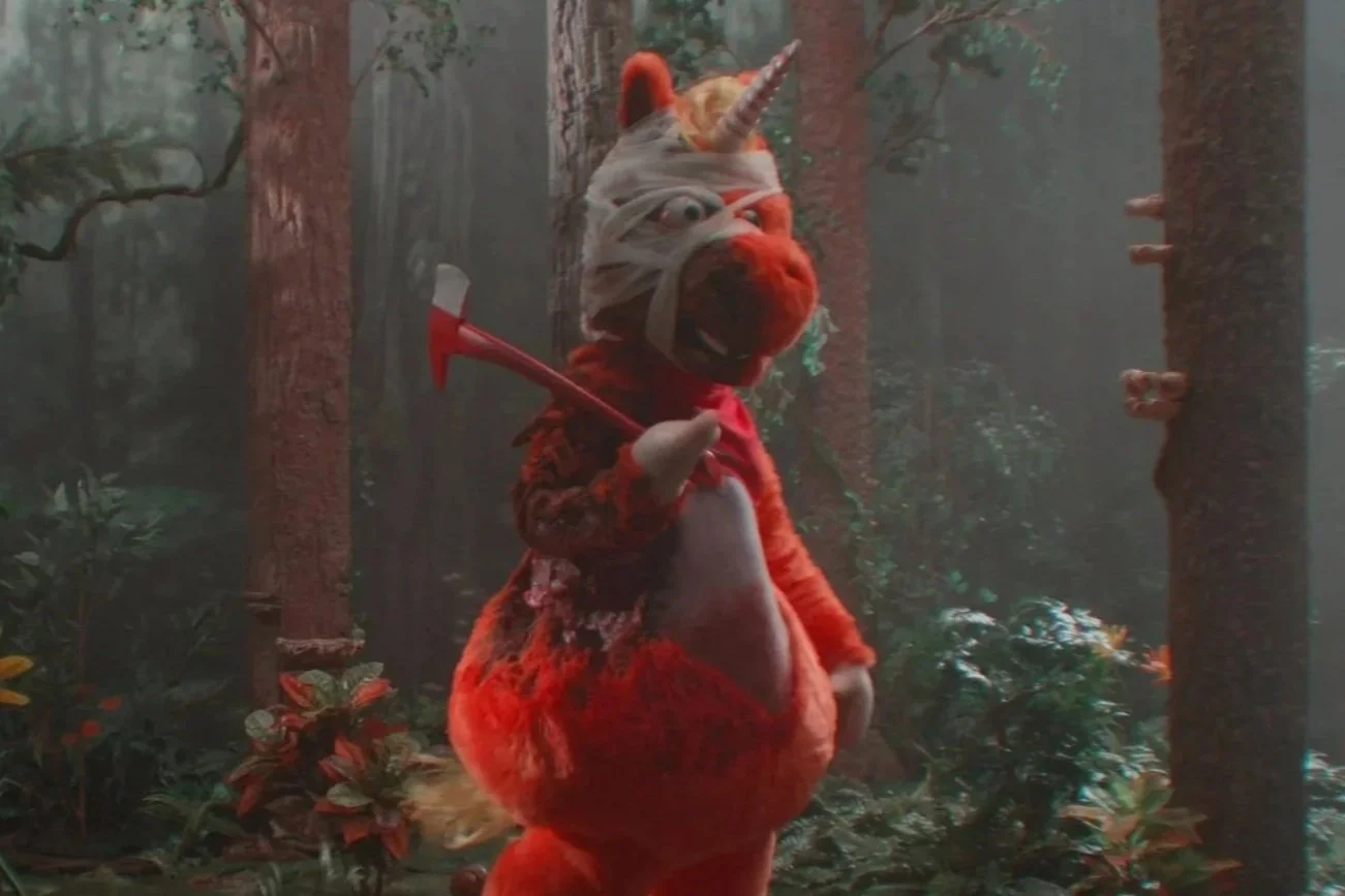 “A brave girl and her friends must escape a kids television show.” That’s all we knew about Buddy before its midnight Sundance premiere at the Library Centre Theatre. The precise plot details were wisely kept under wraps to preserve the film’s immediate, chilling turn: after a saccharine theme song introduces us to a “cuddly, snuggly” plush orange unicorn, he starts to axe his child co-stars.